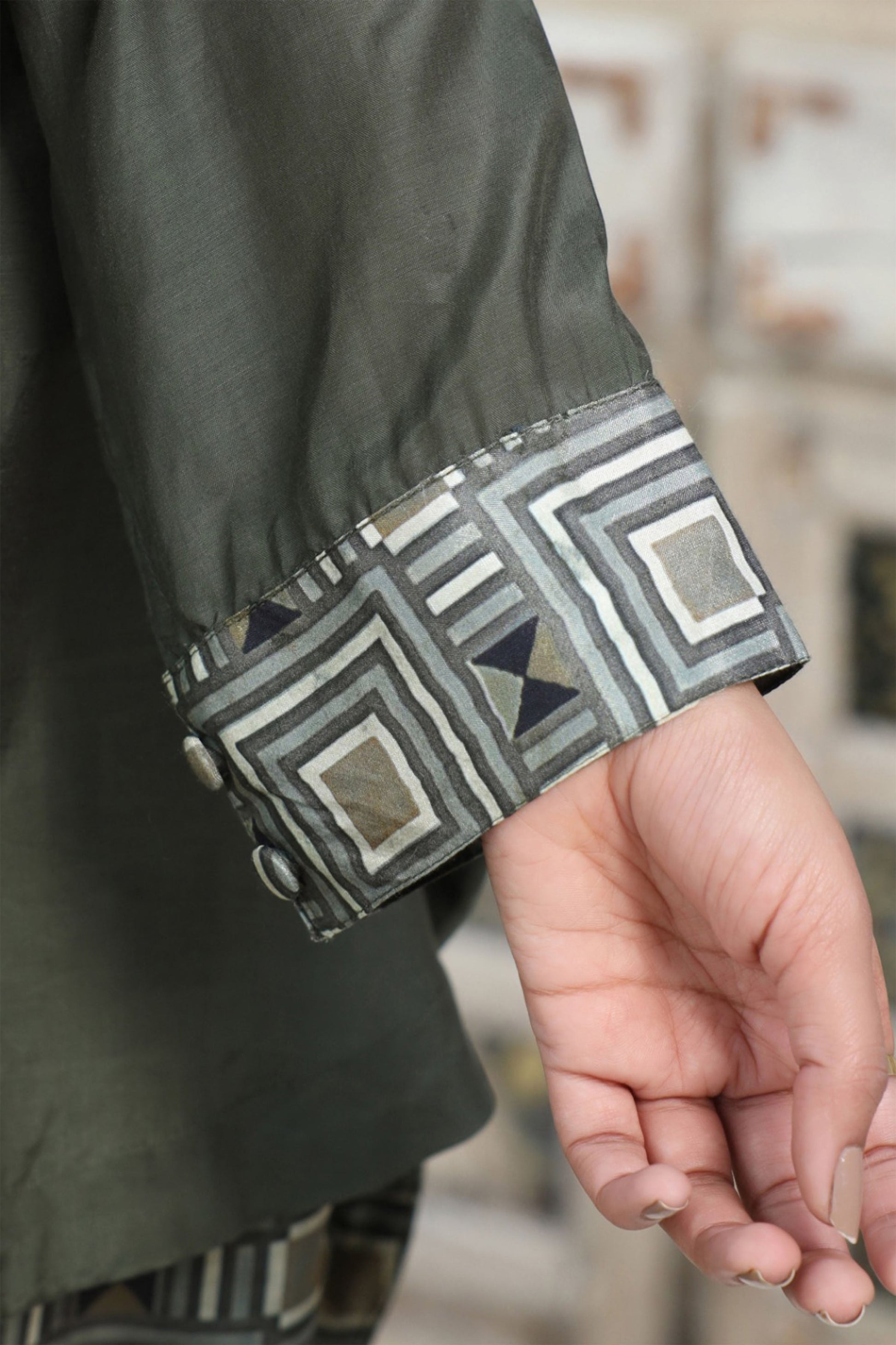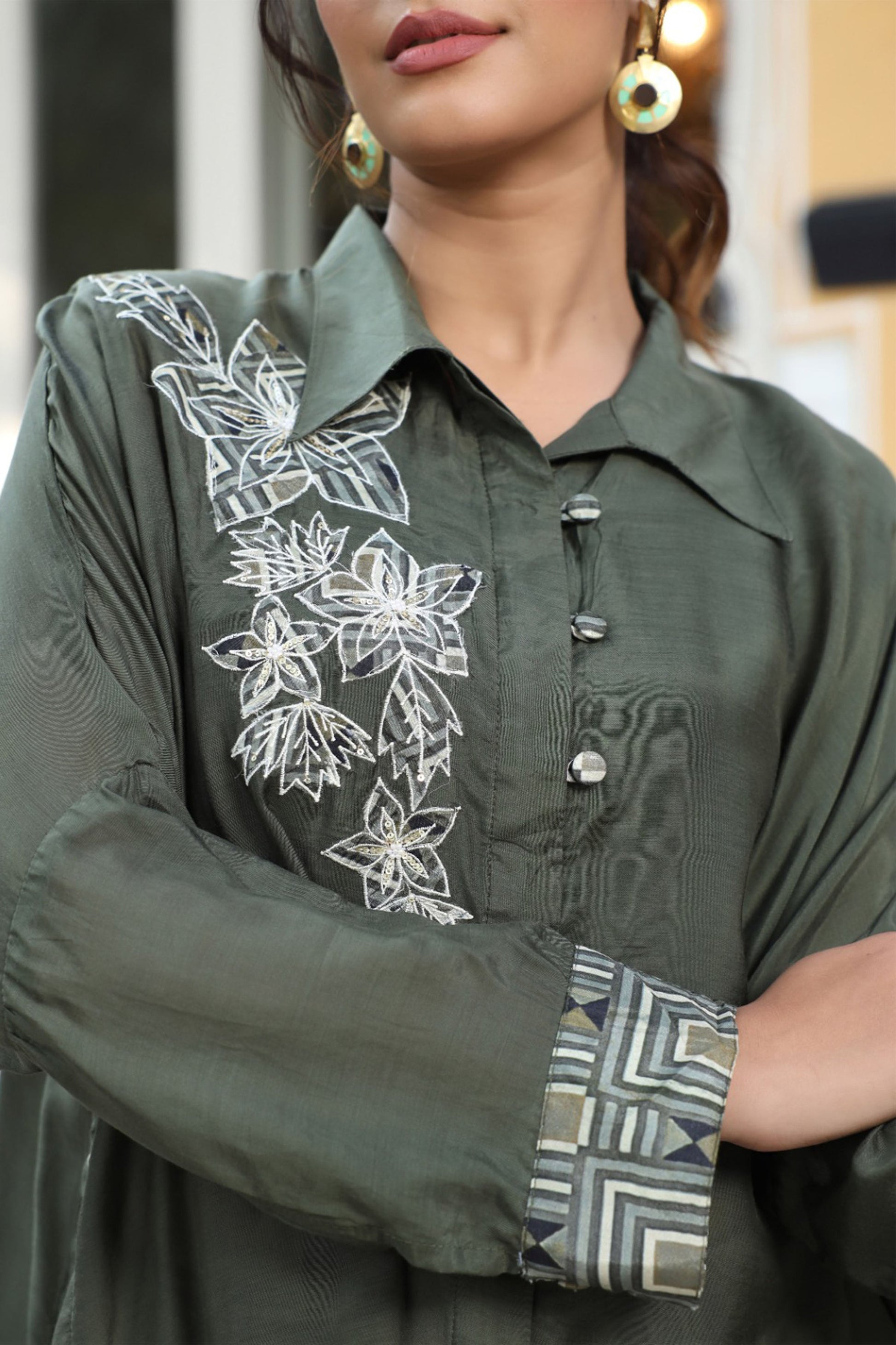 Elevate your style with this Olive Dream Co-ord Set, crafted from muslin fabric and featuring a stunning side shoulder floral design. The sophisticated collar neckline is adorned with elegant button work, while the full sleeves add a touch of refinement. Paired with matching printed bottoms, this versatile ensemble is perfect for casual outings or festive occasions.