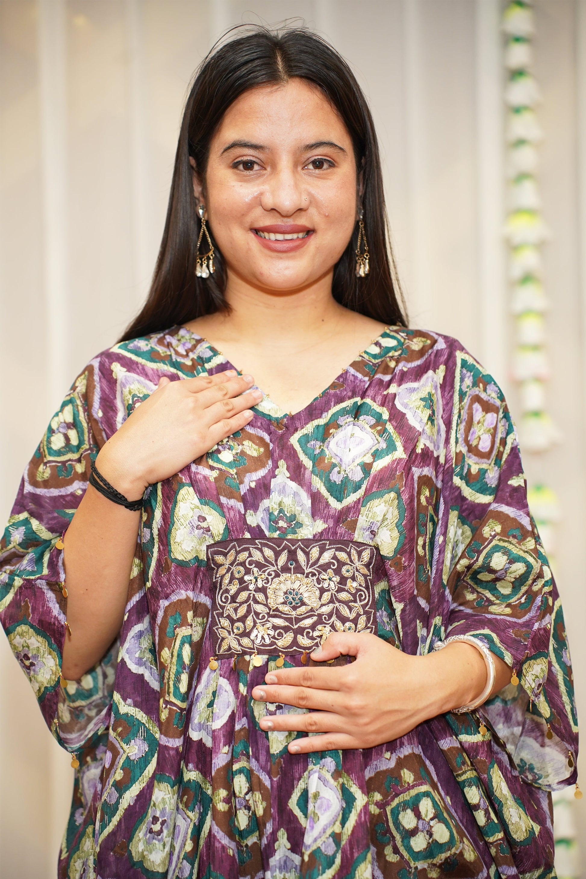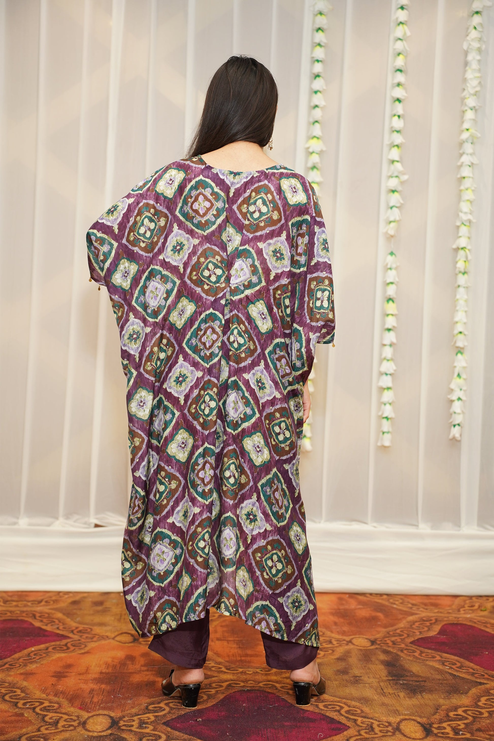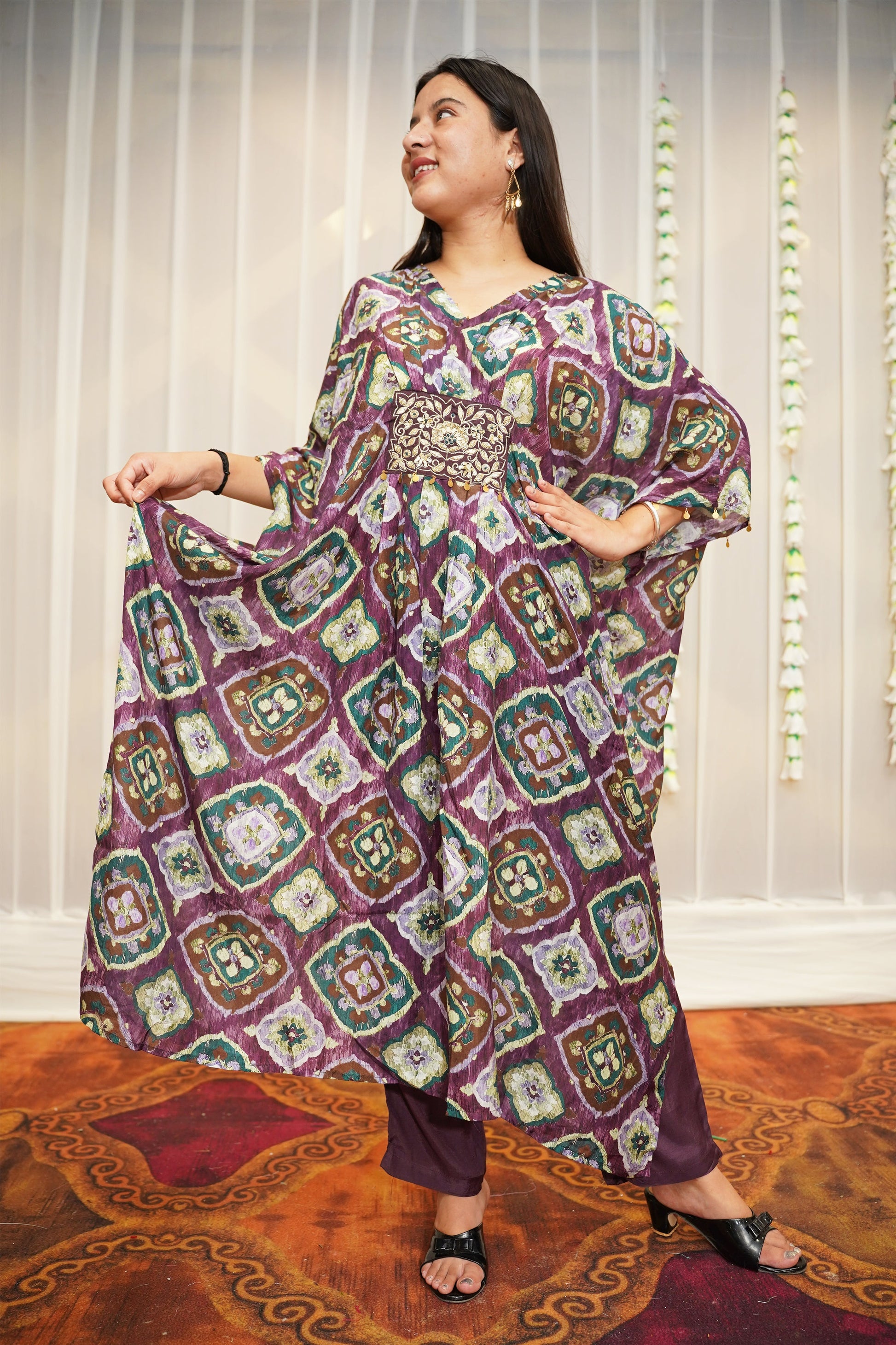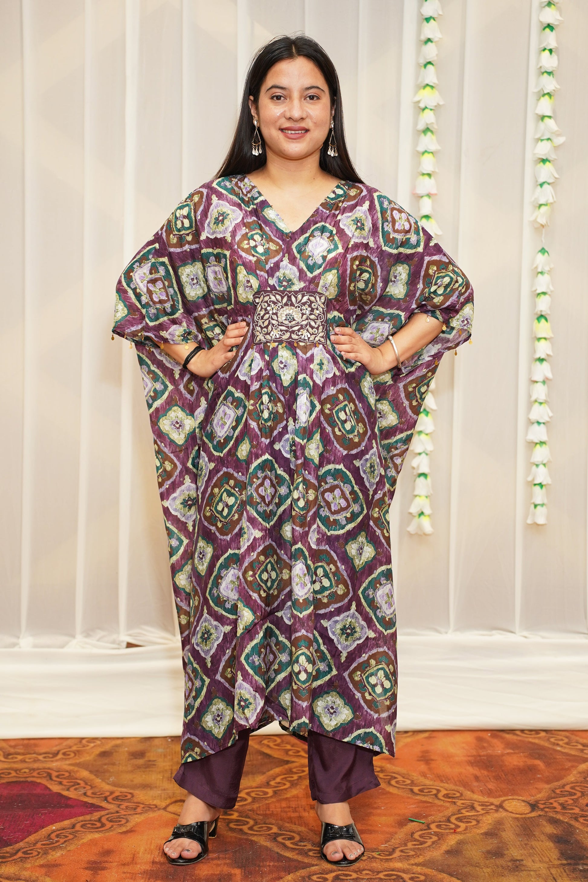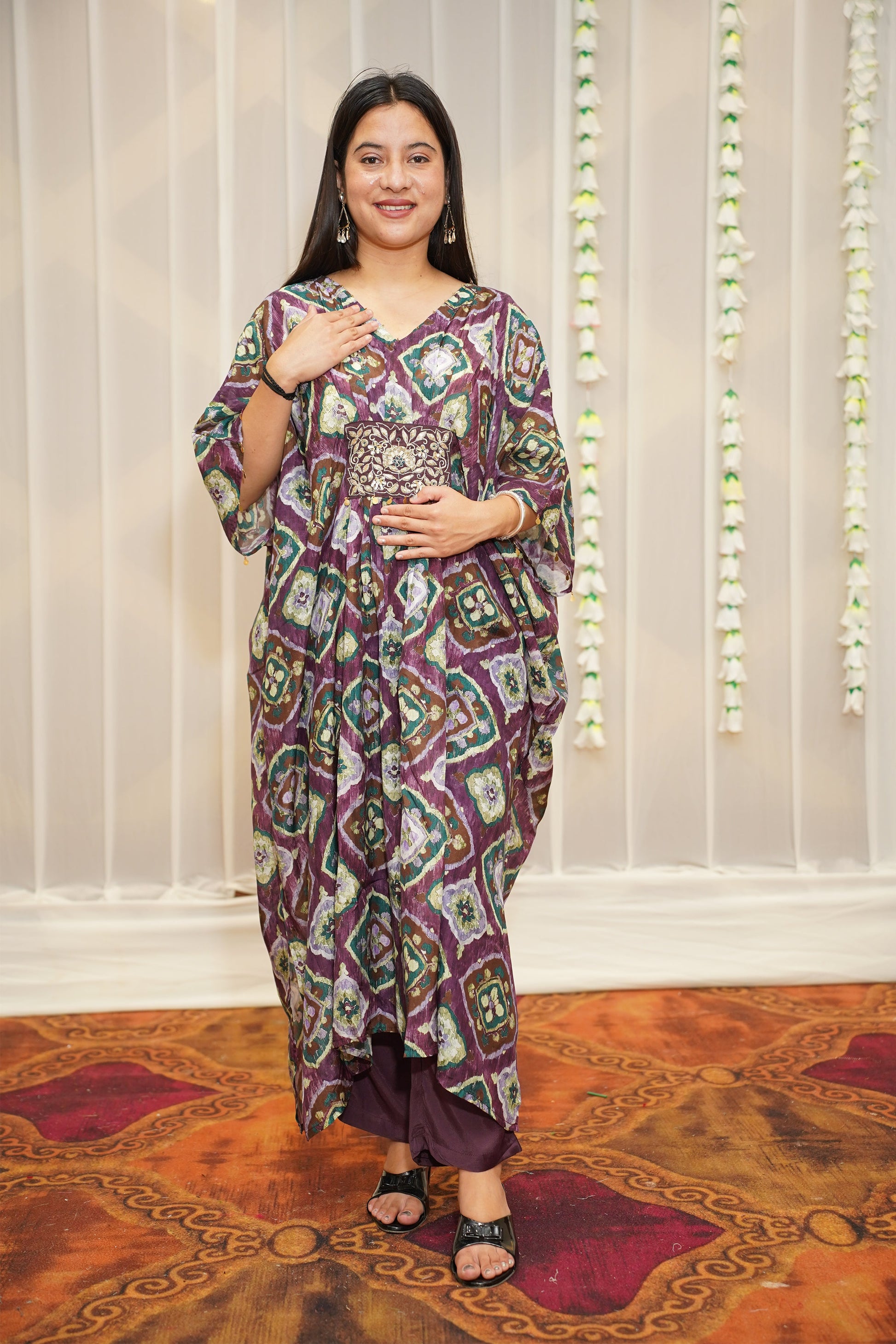 Indulge in sophistication with the Burgundy Kaftan Set! Made from soft silk fabric, it features an all-over print, a V-neckline adorned with bead detailing, and a front patch with exquisite bead work and minimal pleats. This elegant set is paired with a matching plain bottom for a chic, effortless look.